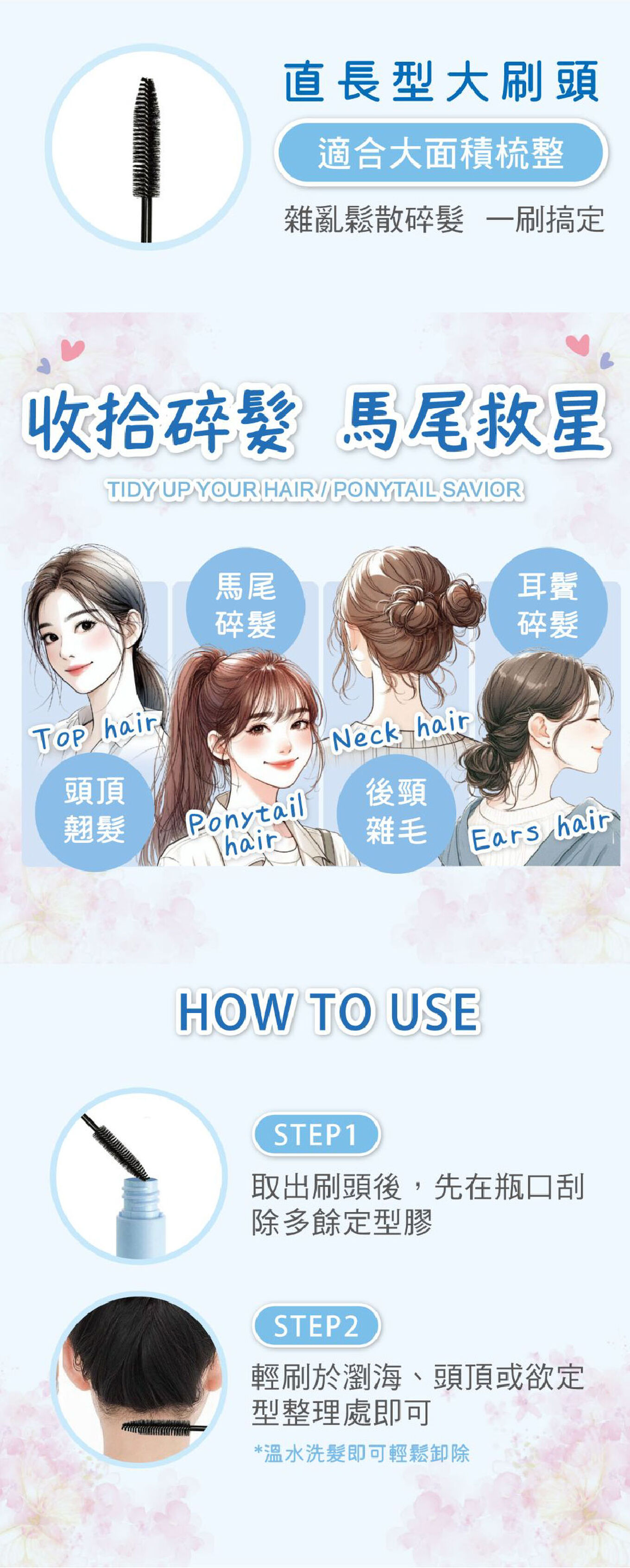 | 用法 | 取出刷頭後,酌量輕刷於欲定型整理處。 |