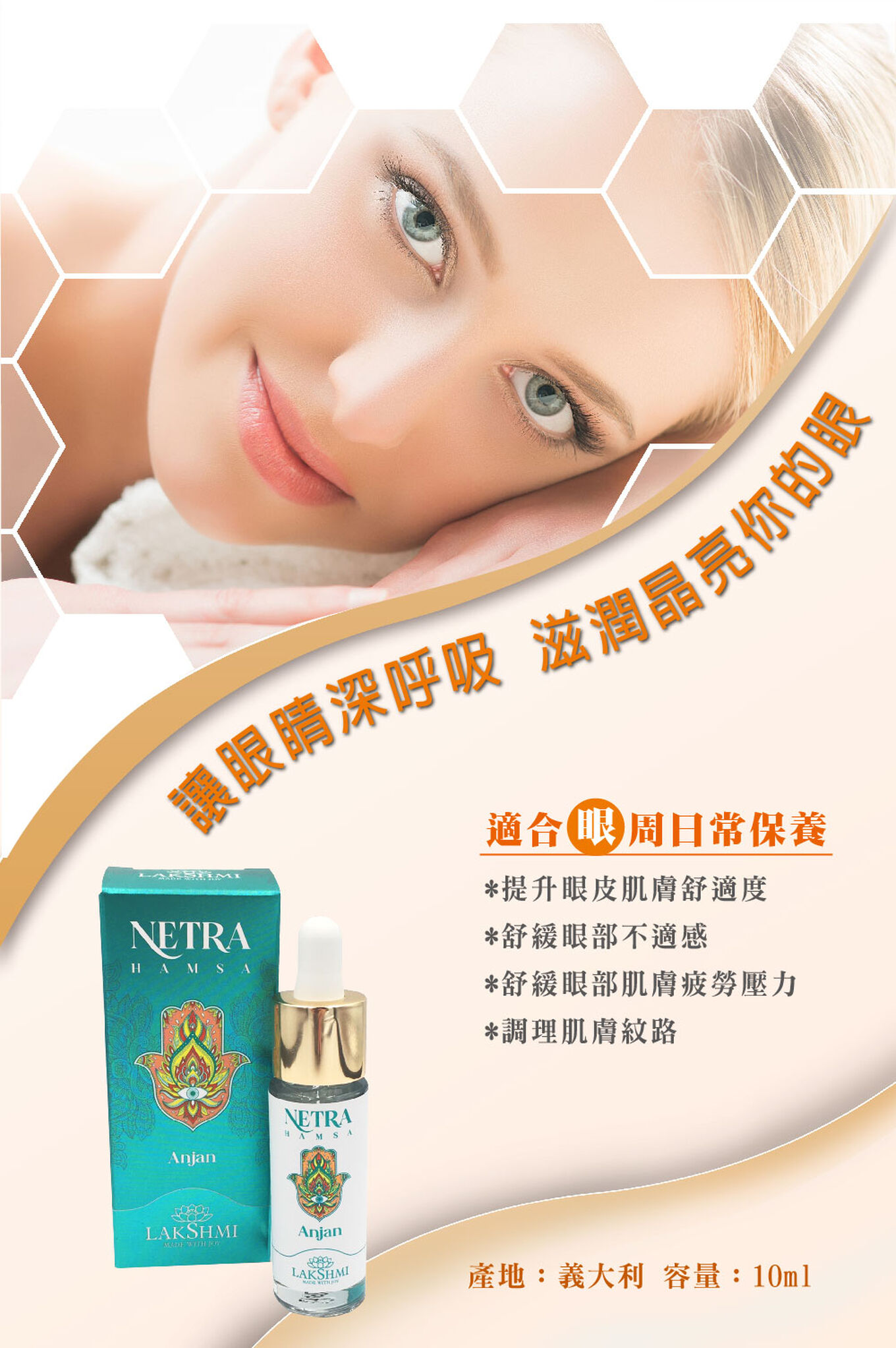 眼週:放鬆、煥亮和舒緩眼部周圍肌肉。調理肌膚紋路、減緩眼周疲倦。
