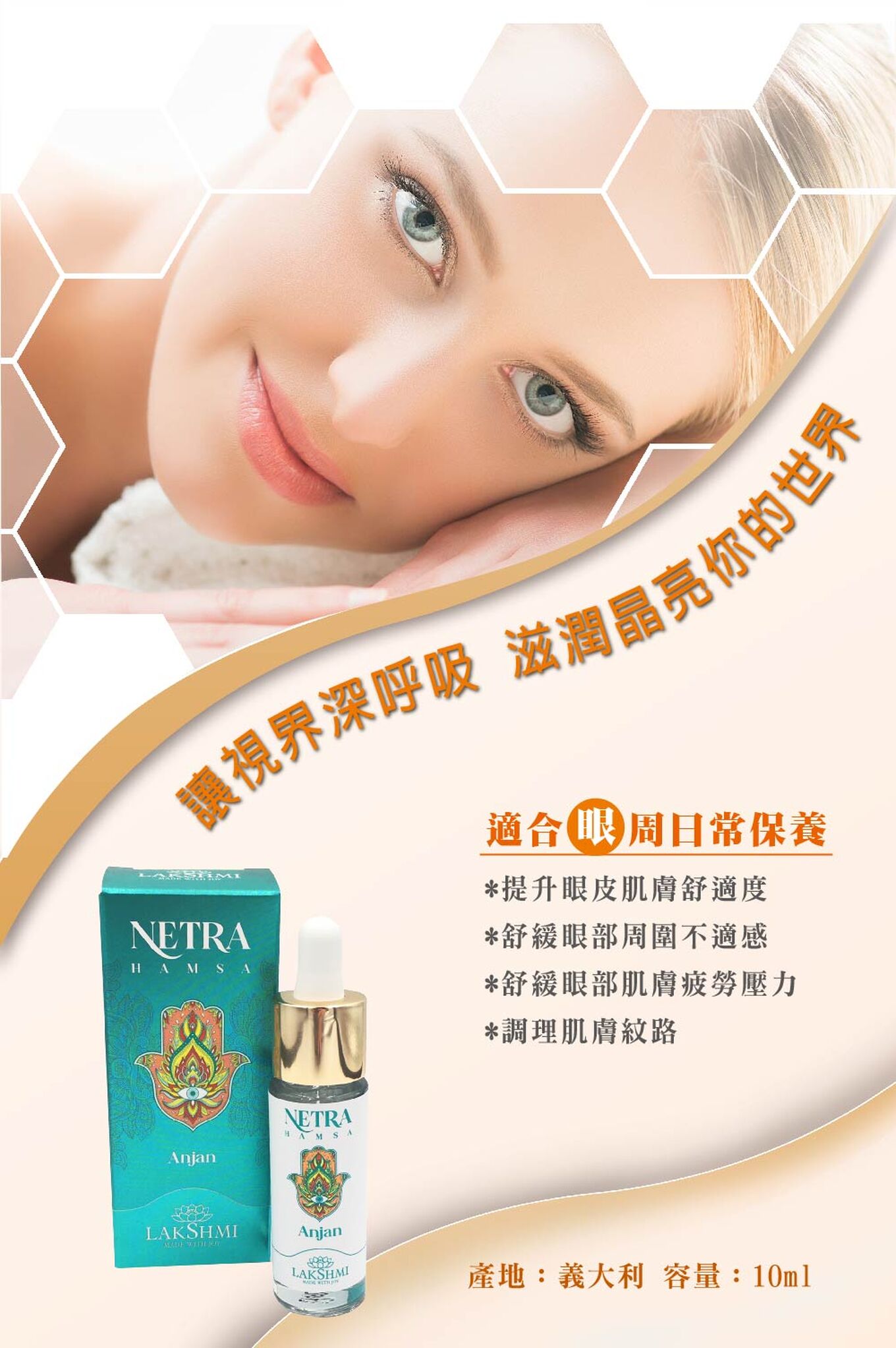 眼週:放鬆、煥亮和舒緩眼部周圍肌肉。調理肌膚紋路、減緩眼周疲倦。