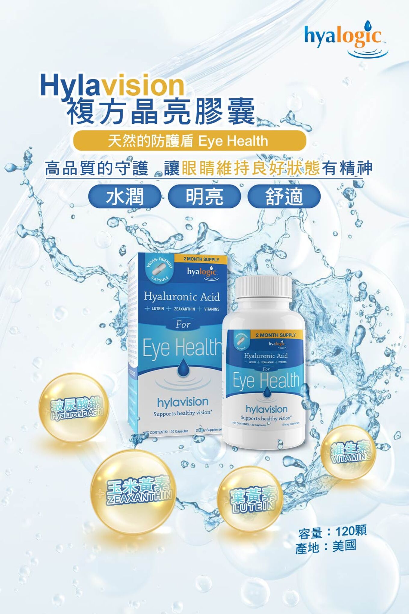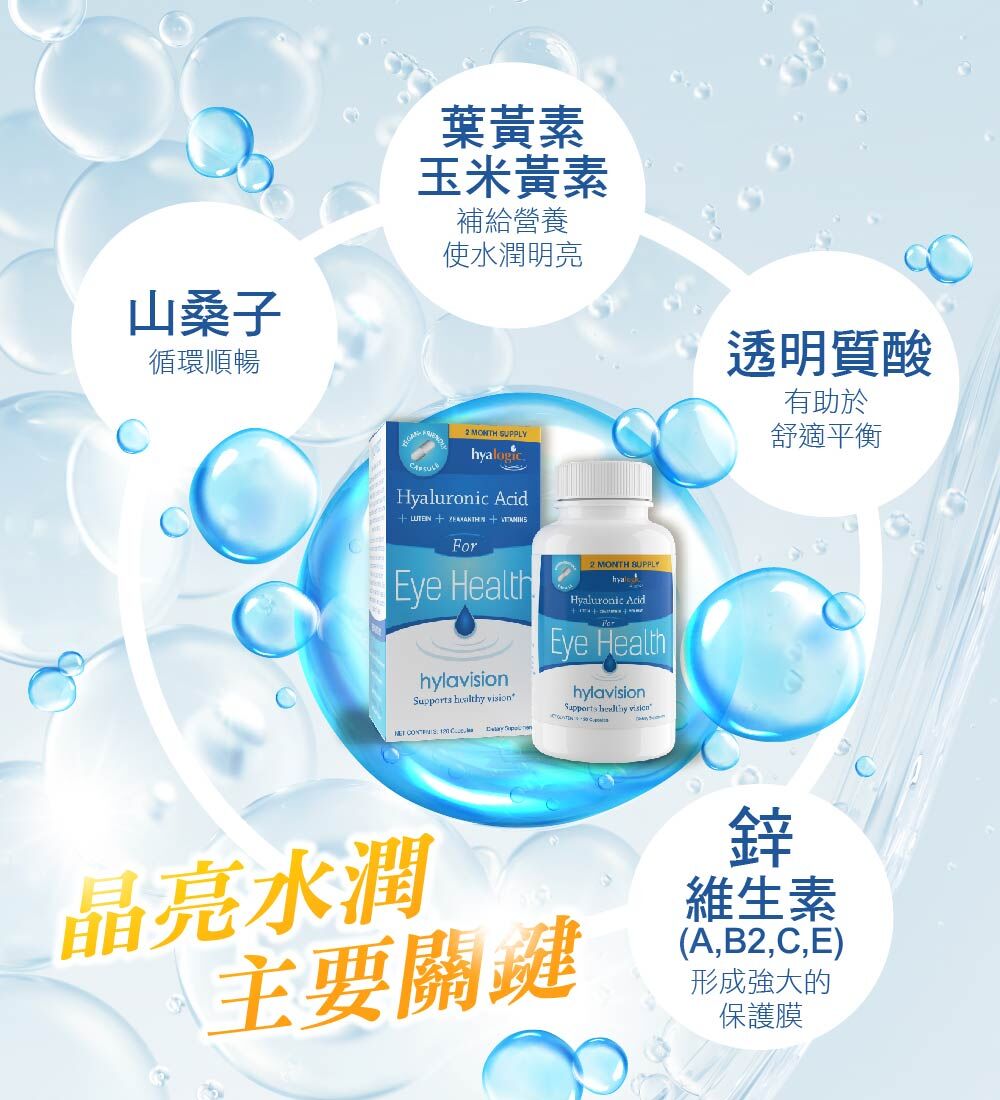 維生素C、羥丙基甲基纖維素、維生素E(維生素E、羥丙基澱粉、二氧化矽)、醋酸鋅、硬脂酸鎂、HAP螫合錳、金盞花萃取物(含葉黃素及玉米黃素)、山桑子萃取物、二氧化矽、β-胡蘿蔔素(羥丙基澱粉、玉米澱粉、 β-胡蘿蔔素、玉米油、維生素E、維生素C)、葡萄糖酸銅、維生素B2、流行鏈球菌發酵物(含透明質酸鈉(玻尿酸鈉)、硒 HylaVision:Has been formulated to provide nutritlonal supplement support for overall eye health Hyaluronic acid:helps maintain healthy fluid balance in the eyes Lutein/Zeaxanthin:Supports retinal and macular health Bilberry:Supports healthy eye circulation Vitamin A , B2,C,E,&Zinc:Powerful antioxidant properties |